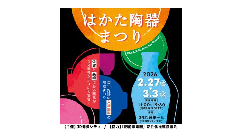 九州の伝統・文化を、もっと身近で感じ、様々なやきものを一堂に楽しめる「はかた陶器まつり」を今年も開催!佐賀・長崎の肥前やきもの圏の産地から人気店が多数 出店しお客さまにやきものの魅力をお届けします。